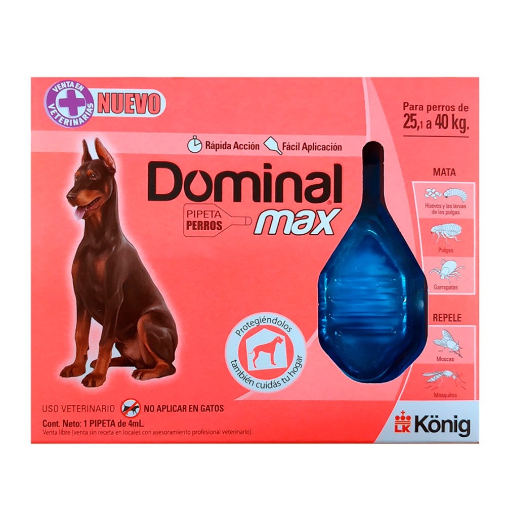 Dominal MAX Perros es una solución pulguicida y garrapaticida de aplicación tópica para perros que suma el efecto ambiental. Dominal MAX Perros contiene Imidacloprid, Permetrina y Fenoxicarb.